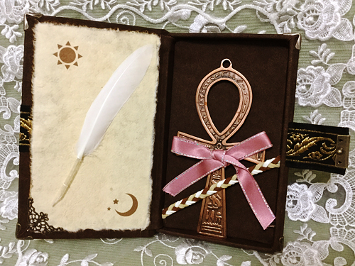 言語化・文字化を意図した「ペンに見立てた風切羽根」「情報を記す紙」が必要と降りてきたので、ケース内部のフタの裏側にそれらを配置。