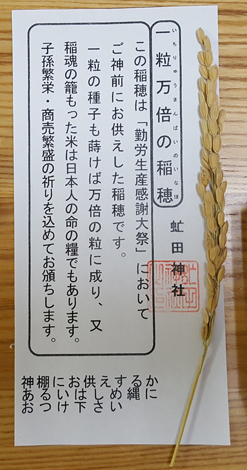S様に「新嘗祭でいただいた一粒万倍の稲穂です」とお渡しすると、私がびっくりするほど喜んでいただけました。